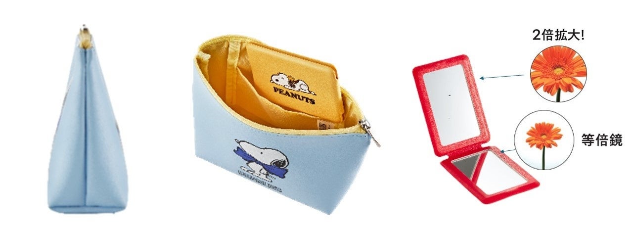 「スヌーピー ポーチ&ミラーセット」のデザインは2種類で、ホイップホワイトカラーのポーチは、ハートを抱えたスヌーピーをあしらい、ブルーカラーのポーチはリボンタイをつけたスヌーピーをデザインしました。またミラーには、それぞれウッドストックとスヌーピーが描かれており、その姿を楽しめます。数量限定の非売品で無くなり次第終了しますので、ぜひこの機会にお早めにお求めください。