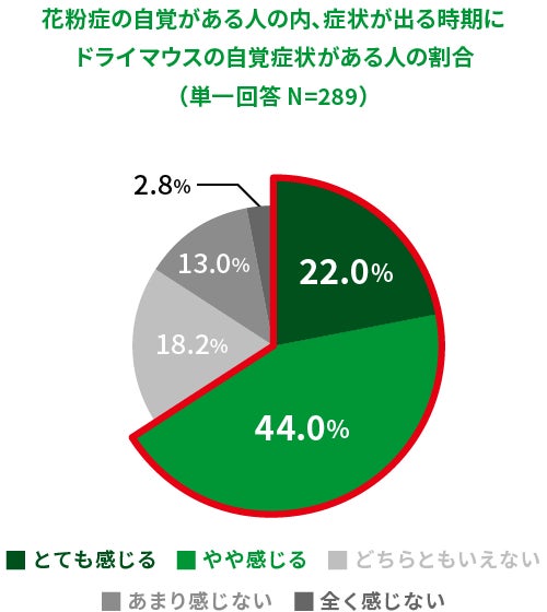 歯垢リスクPR事務局が実施した調査では、「花粉症」「おそらく花粉症」と自覚する人に、症状が出る時期に、口腔内乾燥を感じるかを聞いたところ、「とても感じる(22.0%)」、「やや感じる(44.0%)」と、全体の66.0%が「口の乾きを感じる」と回答。