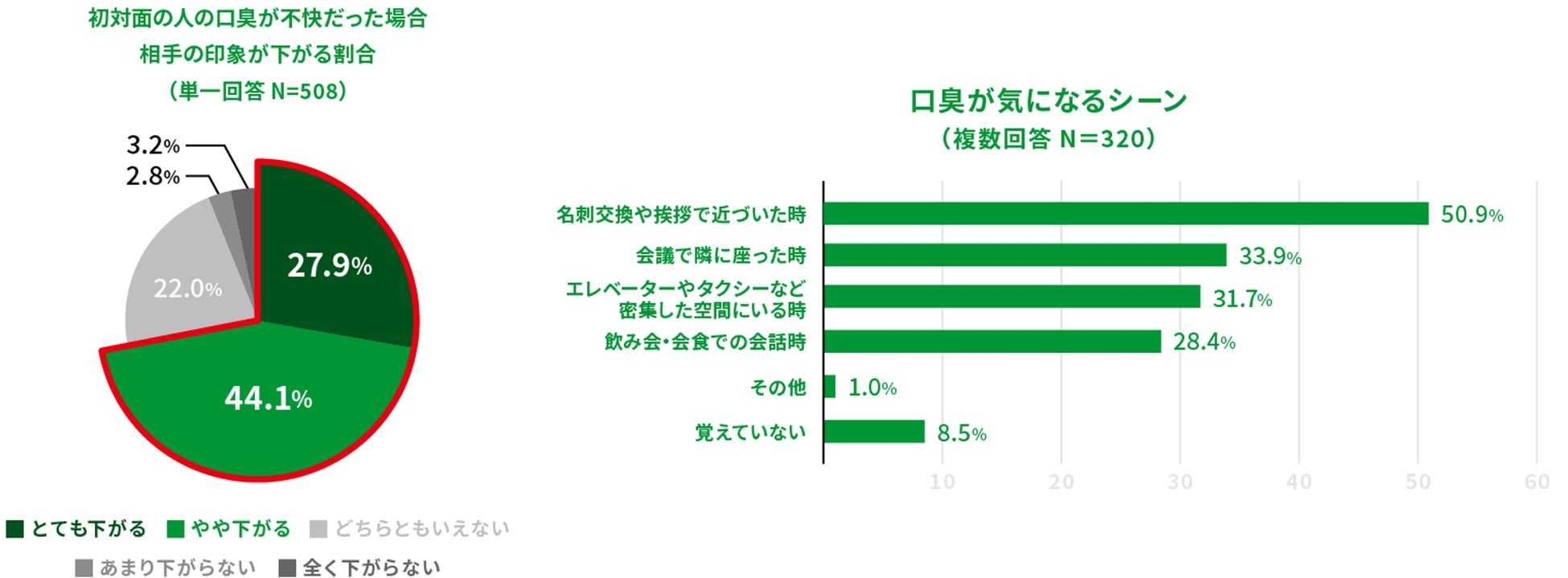 相手の印象が「とても下がる(27.9%)」「やや下がる(44.1%)」と答えた人は7割以上にのぼりました。口臭が気になるシーンTOP3は「名刺交換や挨拶で近づいた時(50.9%)」「会議で隣に座った時(33.9%)」「エレベーターやタクシーなど密集した空間にいる時(31.7%)」。ビジネスシーンでの“距離の近さ”がにおいリスクを高めていることがうかがえます。