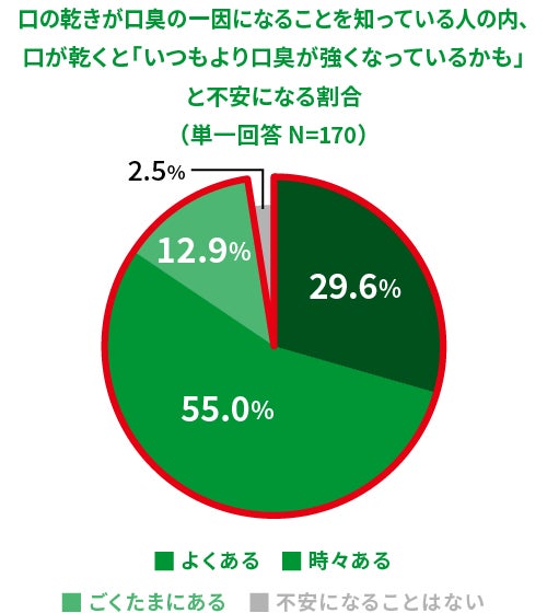 さらに「口の乾き(唾液の分泌が少ない状態)が口臭の一因になる」ことを知っている人のうち、口腔内が乾燥している際に「いつもより口臭が強くなっているかも」と不安を抱く頻度について、「よくある(29.6%)」「時々ある(55.0%)」「ごくたまにある(12.9%)」と97.5%にのぼりました。特に20代では、男性100%、女性95.6%が口臭への不安を感じており、花粉症シーズンにおける“においへの意識の高まり”がうかがえます。