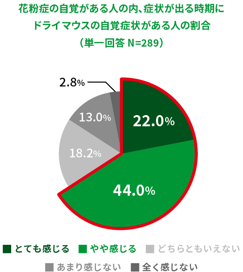 歯垢リスクPR事務局が実施した調査では、「花粉症」「おそらく花粉症」と自覚する人に、症状が出る時期に、口腔内乾燥を感じるかを聞いたところ、「とても感じる(22.0%)」、「やや感じる(44.0%)」と、全体の66.0%が「口の乾きを感じる」と回答。