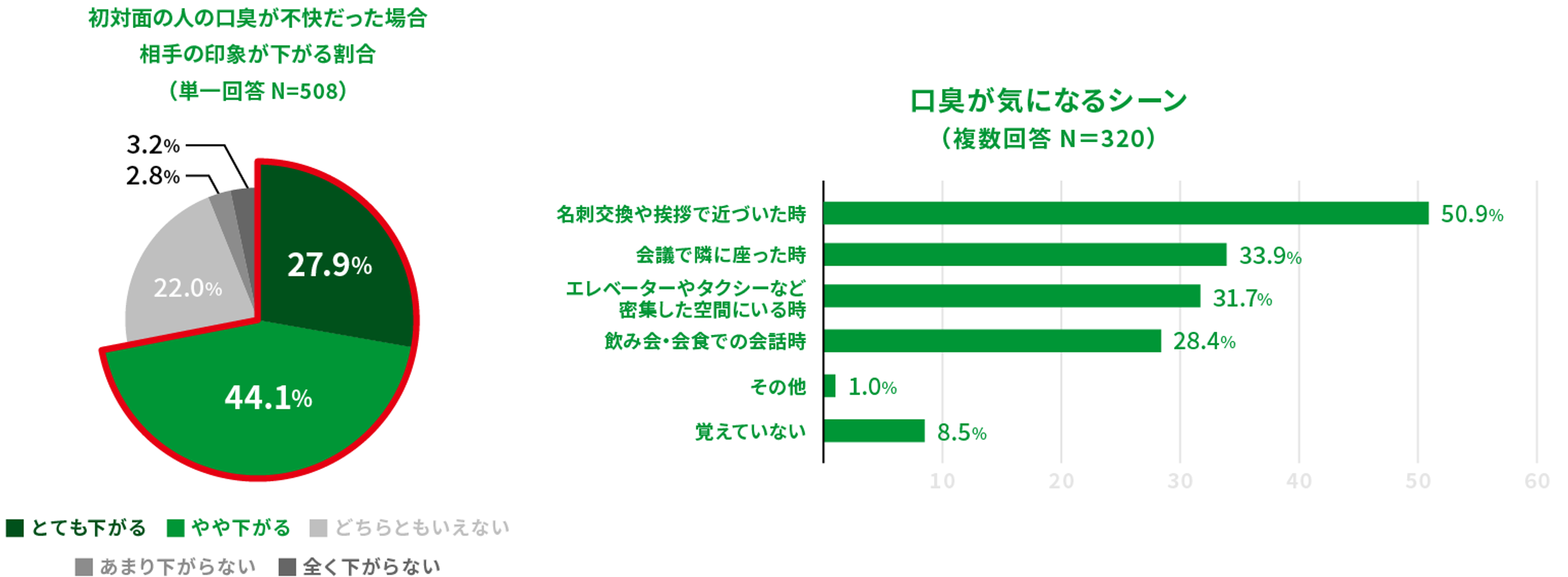 相手の印象が「とても下がる(27.9%)」「やや下がる(44.1%)」と答えた人は7割以上にのぼりました。口臭が気になるシーンTOP3は「名刺交換や挨拶で近づいた時(50.9%)」「会議で隣に座った時(33.9%)」「エレベーターやタクシーなど密集した空間にいる時(31.7%)」。ビジネスシーンでの“距離の近さ”がにおいリスクを高めていることがうかがえます。