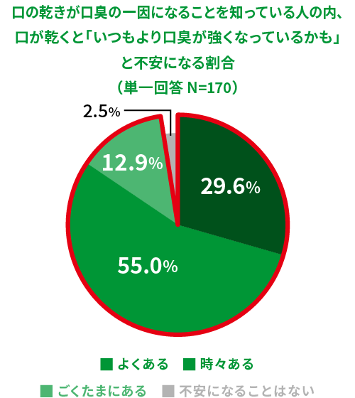 さらに「口の乾き(唾液の分泌が少ない状態)が口臭の一因になる」ことを知っている人のうち、口腔内が乾燥している際に「いつもより口臭が強くなっているかも」と不安を抱く頻度について、「よくある(29.6%)」「時々ある(55.0%)」「ごくたまにある(12.9%)」と97.5%にのぼりました。特に20代では、男性100%、女性95.6%が口臭への不安を感じており、花粉症シーズンにおける“においへの意識の高まり”がうかがえます。