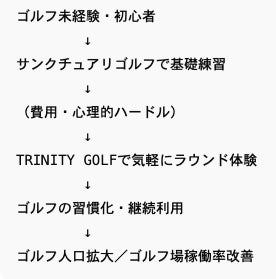 ゴルフ初心者が持つ課題を解決するため、定額制でゴルフラウンドを楽しめる「トリニティゴルフ」と、初心者向けゴルフスクール「サンクチュアリゴルフ」が連携、以下のサービスをそれぞれの会員様に提供して参ります。