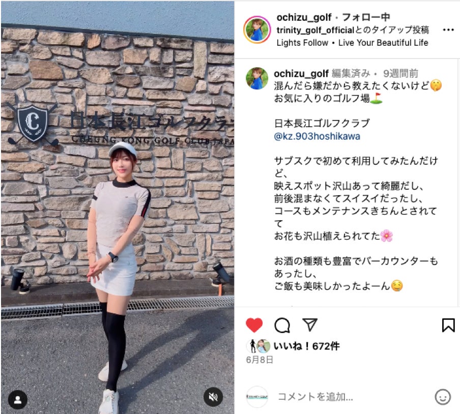 TRINITY GOLFでは、メンバーがInstagramなどのSNSを通じてゴルフ体験を発信することで、提携ゴルフ場のプロモーションを支援しています。