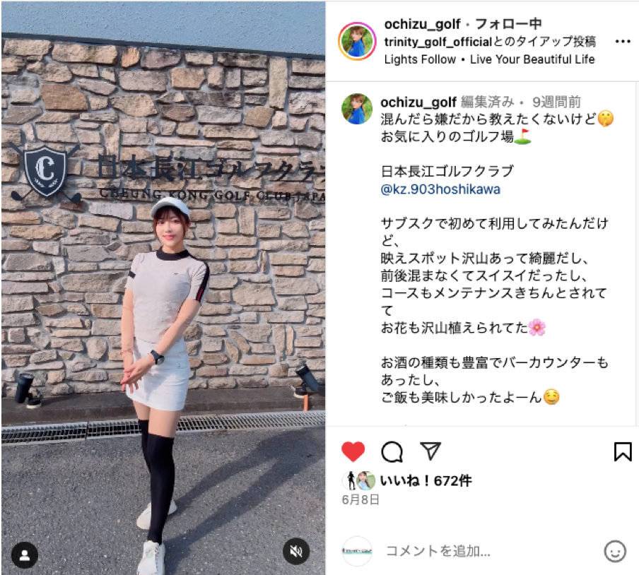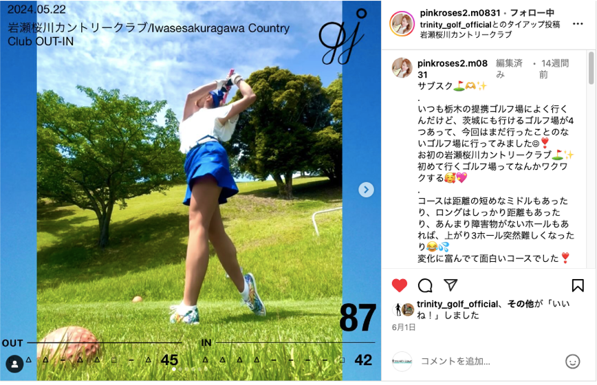 TRINITY GOLFでは、メンバーがInstagramなどのSNSを通じてゴルフ体験を発信することで、提携ゴルフ場のプロモーションを支援しています。