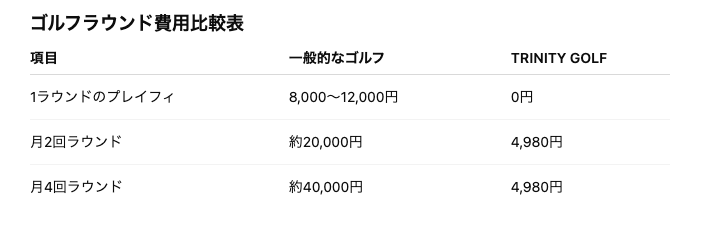 「TRINITY GOLF」は、月額4,980円(税込)で、提携ゴルフ場のプレイフィが無料となり、何度でもゴルフラウンドを楽しめるサブスクリプションサービスです。