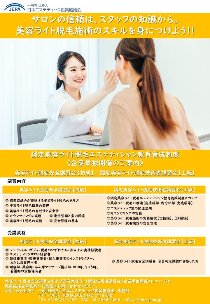 こうした背景を受け、一般社団法人日本エステティック振興協議会(理事長 瀧川睦子)は、エステティック関連企業を対象とした「企業単独開催」形式による「美容ライト脱毛安全講習会」および「認定美容ライト脱毛技術者講習会」を実施しています。