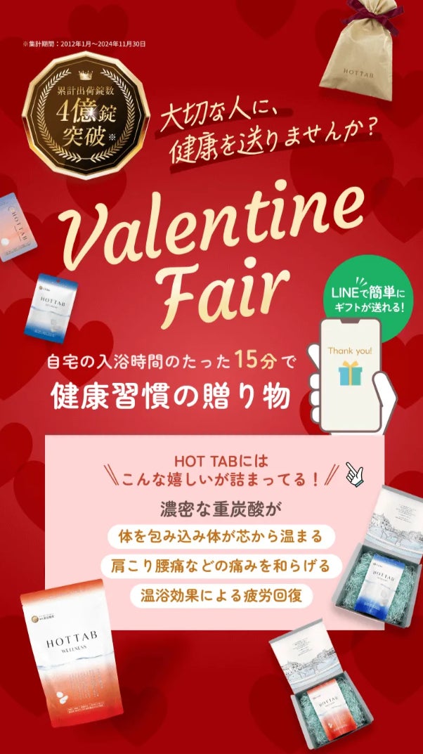 純正重炭酸入浴剤の製造特許技術を保有する、重炭酸の開発元であり、業界のパイオニアとして多くのメーカーにもOEM提供する、株式会社ホットアルバム炭酸泉タブレット(本社:東京都八王子市、代表取締役社長:小星重治)は、バレンタインシーズンに向けて、無香料・無着色の“純正”重炭酸入浴剤「HOT TAB 健康入浴バレンタインギフト」を、LINEやメールで贈れるeギフトとして提供開始いたします。