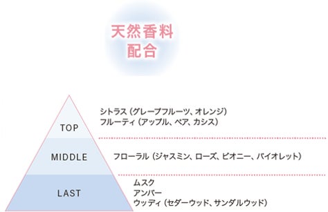 華やかなフローラルと甘さを抑えたフルーツでみずみずしさを感じる香りです。