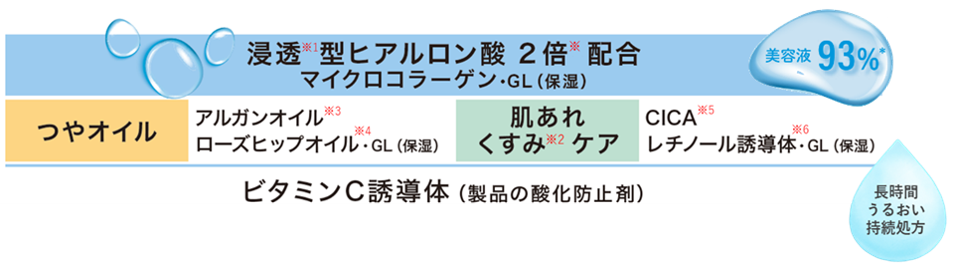 *粉体を除く ※ 従来品比 ※1 角層まで ※2乾燥による ※3 アルガニアスピノサ核油 ※4 カニナバラ果実油※5 ツボクサ葉エキス ※6 パルミチン酸レチノール