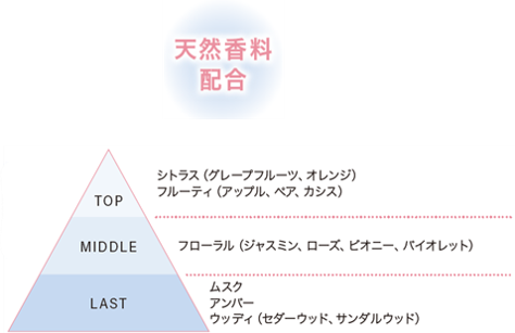 華やかなフローラルと甘さを抑えたフルーツでみずみずしさを感じる香りです。