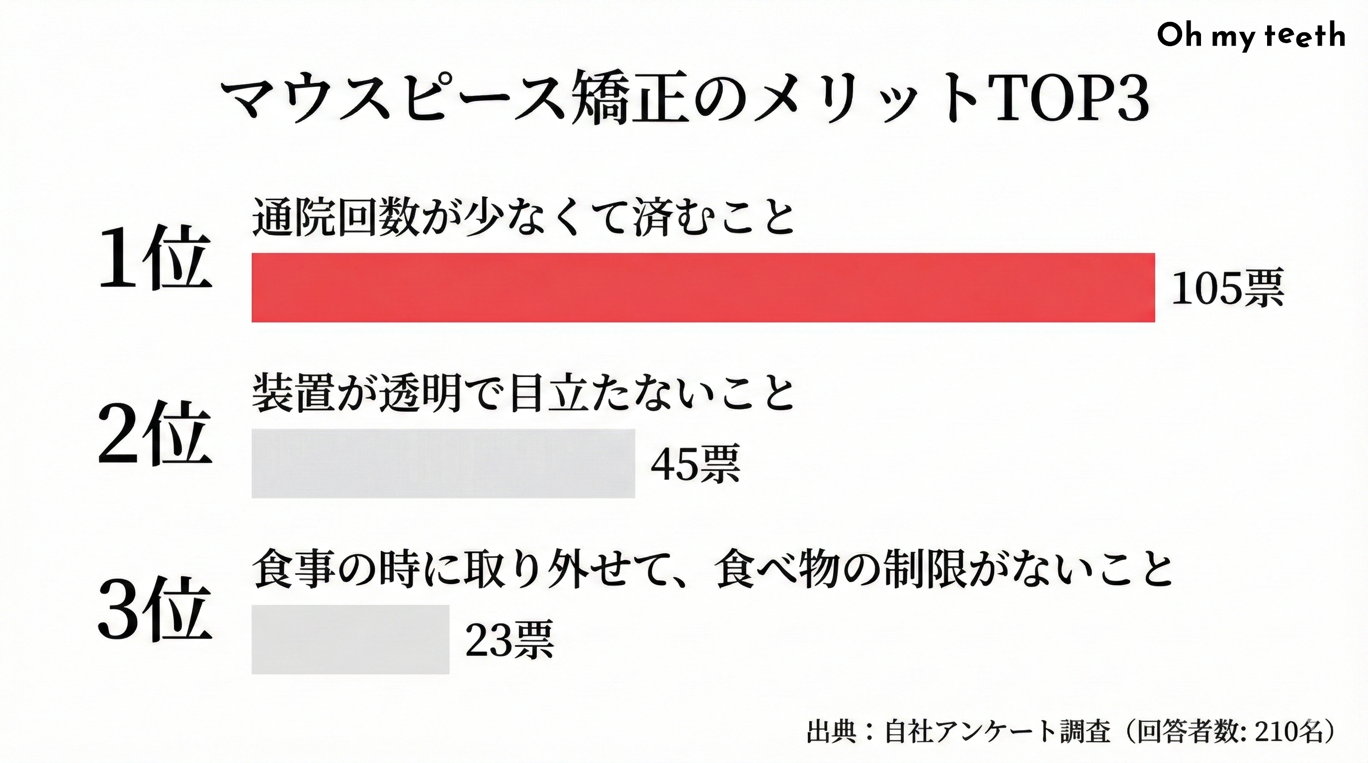一方で、マウスピース矯正のメリットとして圧倒的な支持を集めたのは「通院回数が少なくて済むこと(105名)」でした。
