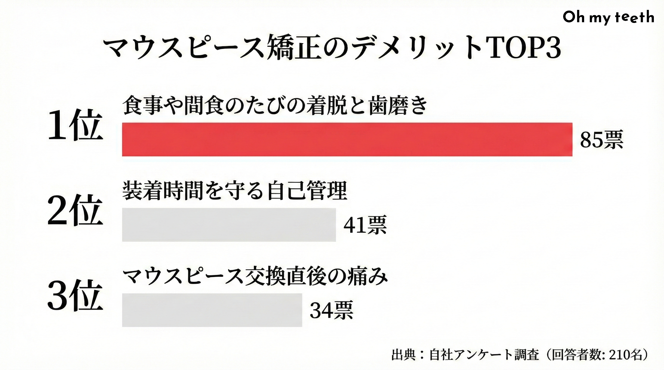 株式会社Oh my teeth(本社:東京都新宿区、代表取締役CEO 西野 誠)は、矯正治療を完了した210名を対象に実施した調査により、マウスピース矯正のリアルな負担が明らかになりました。