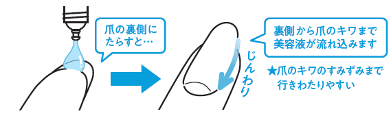 1滴ずつ量を調整しながら垂らせる滴下チューブを採用。甘皮や爪の横、さらに「自爪」のためのセルフケアで重要視される爪の裏側(ハイポニキウム※2)など、細かい部分のすみずみまで美容液を届けます。
