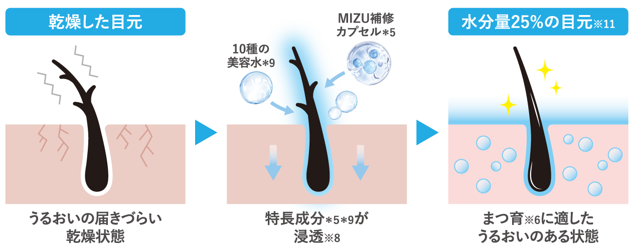 独自処方の「MIZU補修カプセル*5」を配合。3重ヒアルロン酸*6・ケラチン*7・ペプチド*8をリポソーム化することで、ダメージが気になるまつ毛を集中補修し、みずみずしくハリ・コシのある印象へと導きます。