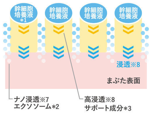 近年、美容業界で注目を集める「ヒト幹細胞培養液*1」と「ナノ浸透※7エクソソーム*2」を配合。さらに、「高浸透サポート成分※8*3」が美容液成分*4をすみずみまで行き渡らせ※8、すっぴんロング※3なまつ毛づくりをサポートします。