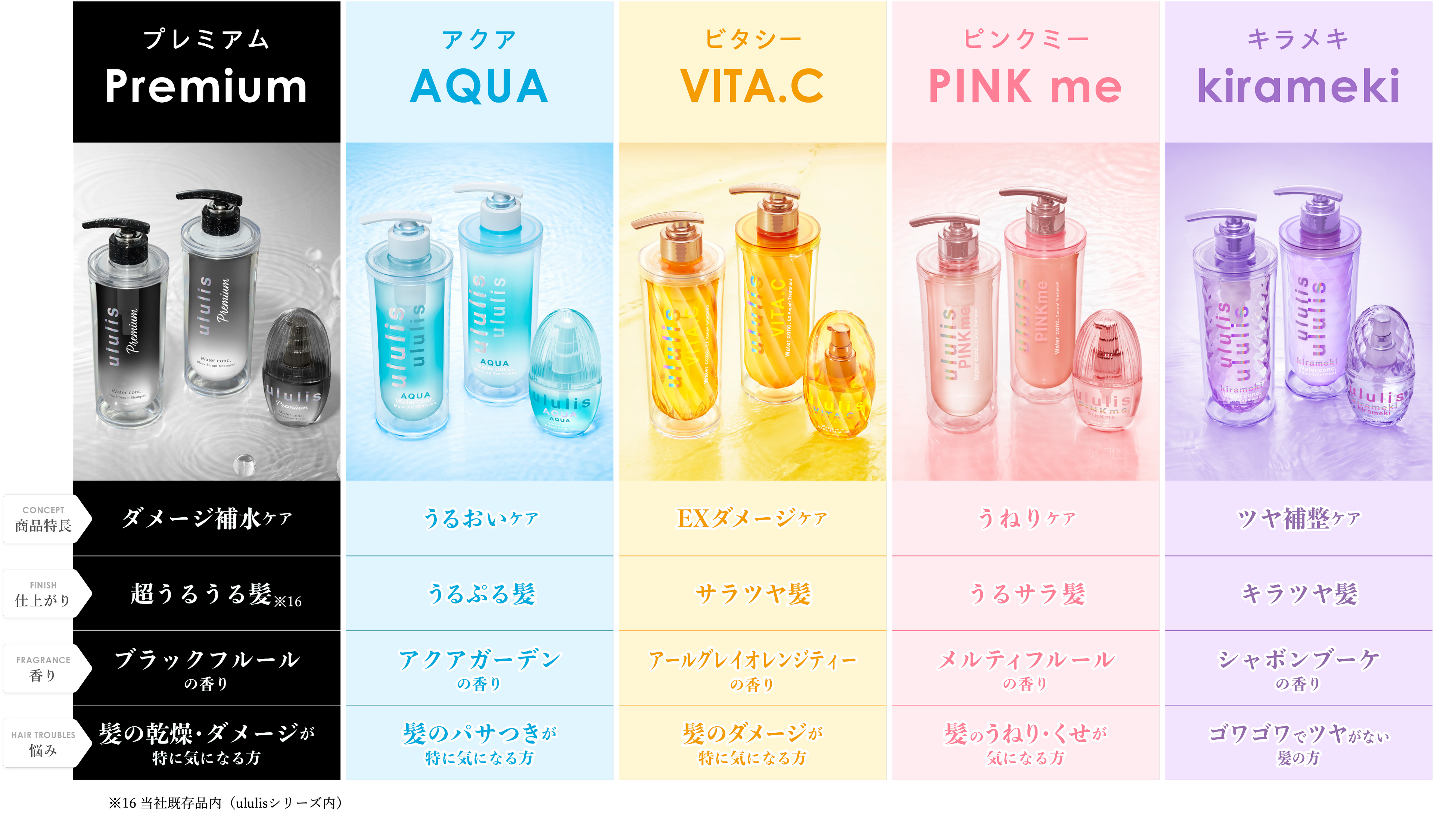 うるおいケアの「AQUA(アクア)」、EXダメージケアの「VITA.C(ビタシー)」、うねりケアの「PINKme(ピンクミー)」、ツヤ補整ケアの「kirameki(キラメキ)」、スペシャルケアの「Premium(プレミアム)」の5シリーズ展開。