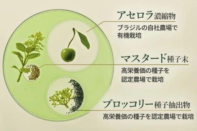 ヘルシーエイジングを支えるための厳選成分として、ブラジルの自社農場(ウバジャラ農場)で有機栽培されたアセロラから抽出した濃縮物に加え、ニュートリライト™ 認定農場で栽培された栄養価の高いブロッコリーの種子抽出物とマスタードの種子末を使用しています。自然の力とサイエンスの知見を融合し、健やかさをサポートします。