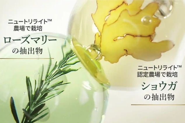 ニュートリライト農場で栽培されたローズマリーの抽出物と、認定農場で栽培されたショウガの抽出物を、科学的な知見から導きだされた最適解の配合でブレンド。