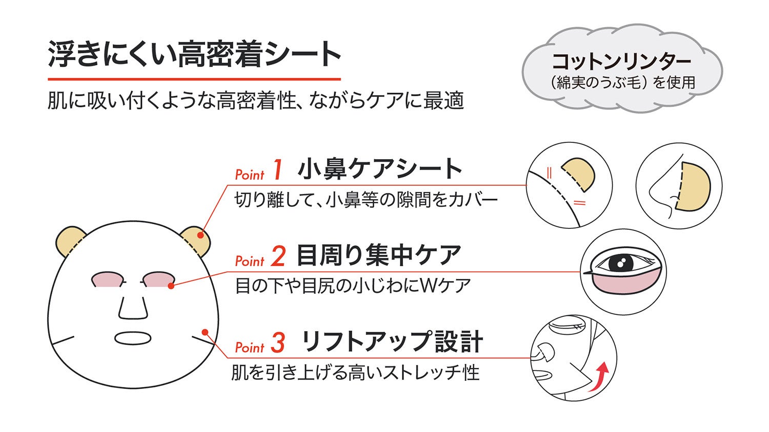 フェイスマスクシートには、コットンシードの周りに生えている希少なうぶ毛コットン由来の繊維を100%使用。ながらケアにも最適な、浮きにくい高密着シートを実現しました。