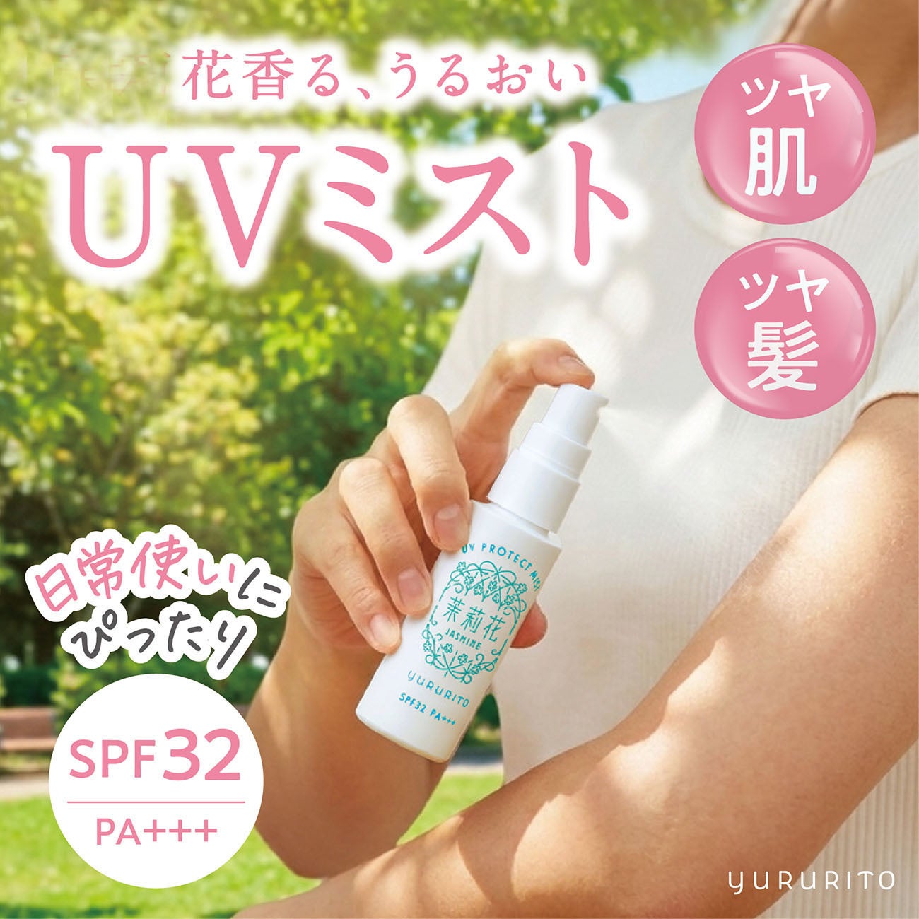 「ゆるりと UVミスト」はSPF32/PA+++で、日常の紫外線による日やけや乾燥ダメージから肌・髪を守ります。