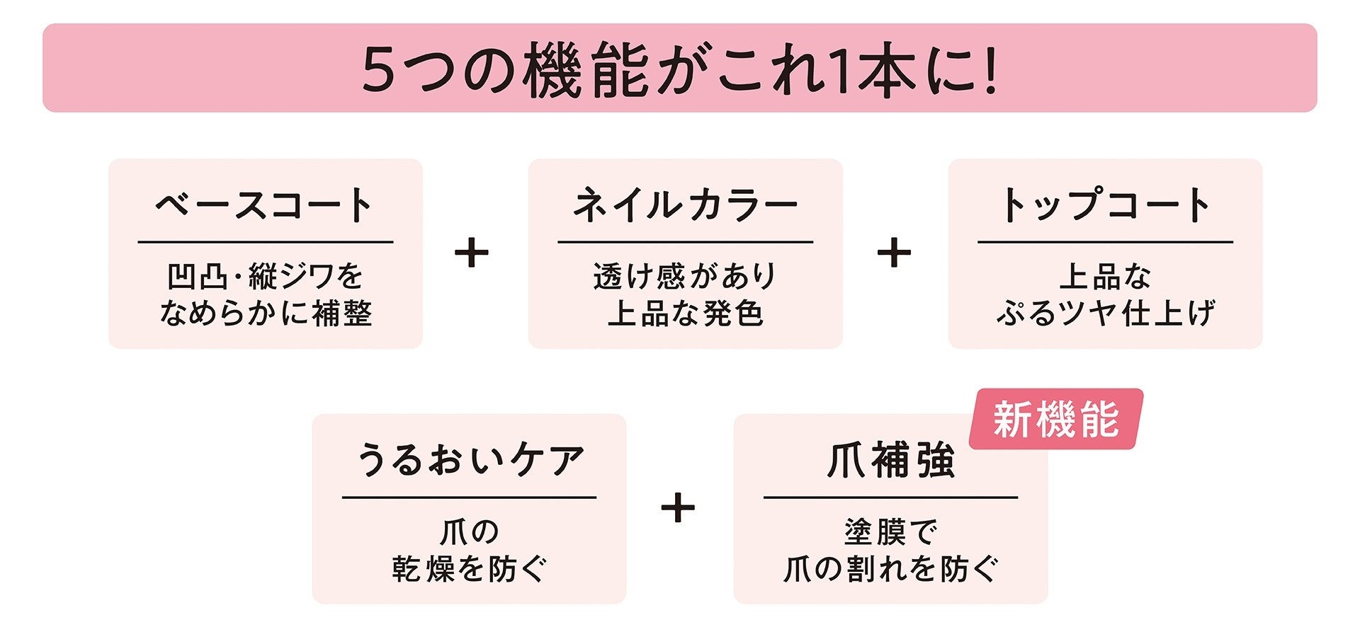 4つの機能(ベースコート、ネイルカラー、トップコート、うるおいケア)に爪補強(塗膜で爪の割れを防ぐ)が加わり5つの機能へ。はがれにくさもUPいたしました。カラーラインナップも新たにベーシックで使いやすい全6色をご用意。