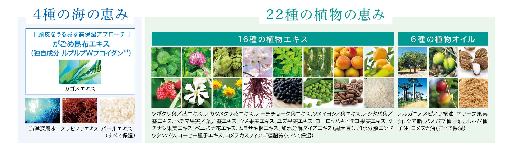 がごめ昆布に着目しシオノギヘルスケアと共同開発した、高分子フコイダン(表面をうるおいコート)と低分子化フコイダン(内部*³にうるおいを届ける)を組み合わせた「がごめ昆布エキス[独自成分ルプルプWフコイダン(シオノギ海藻エキス)*²]」の配合により毛髪の保水力を高めることができます。