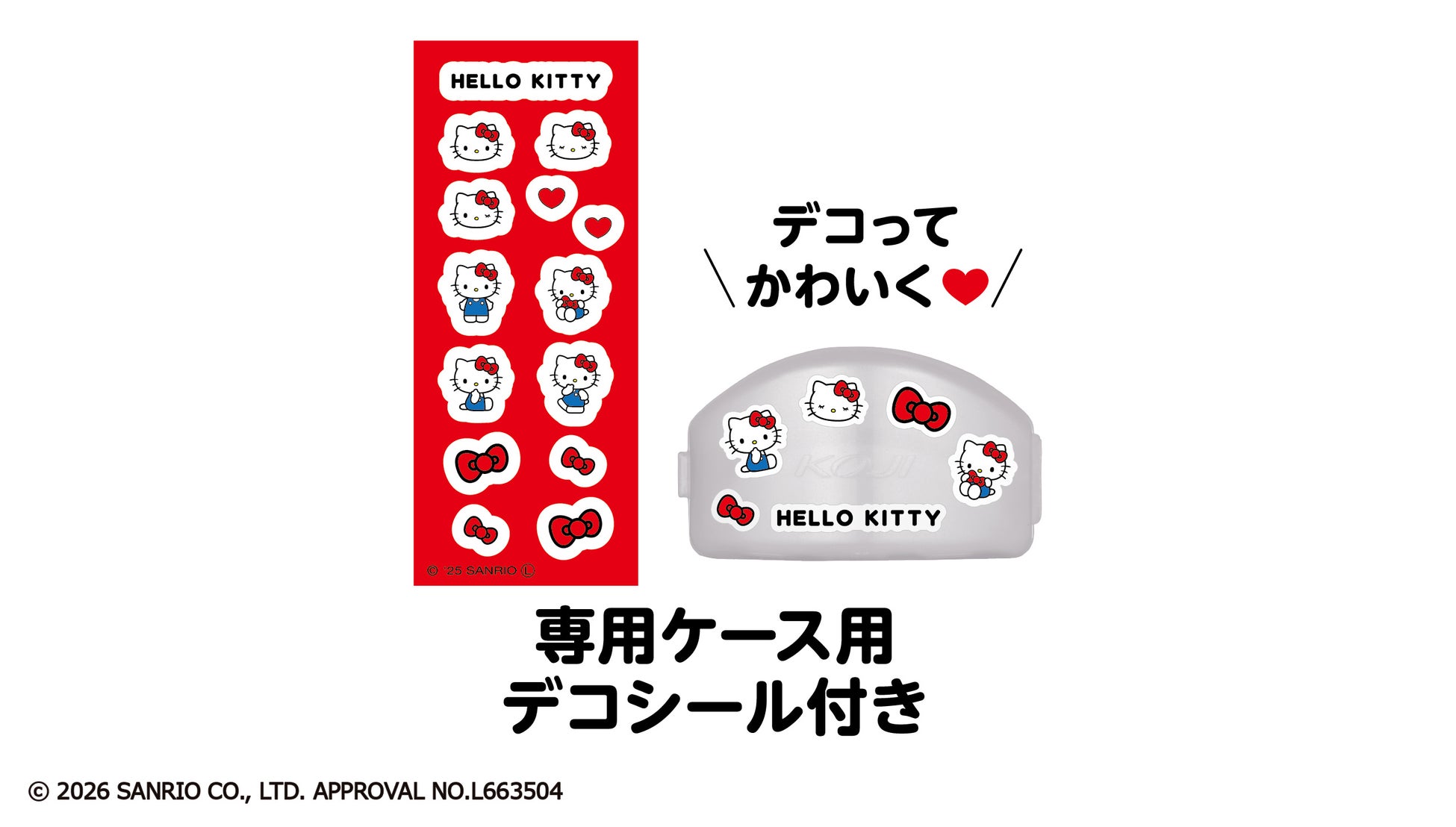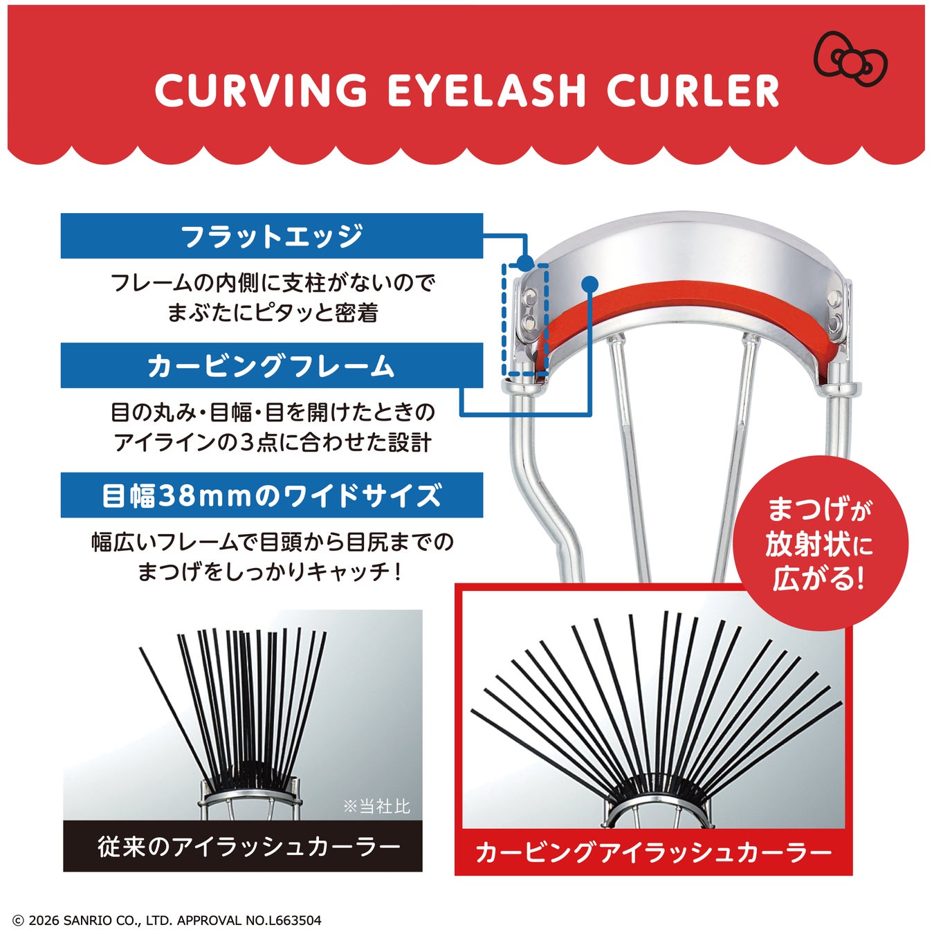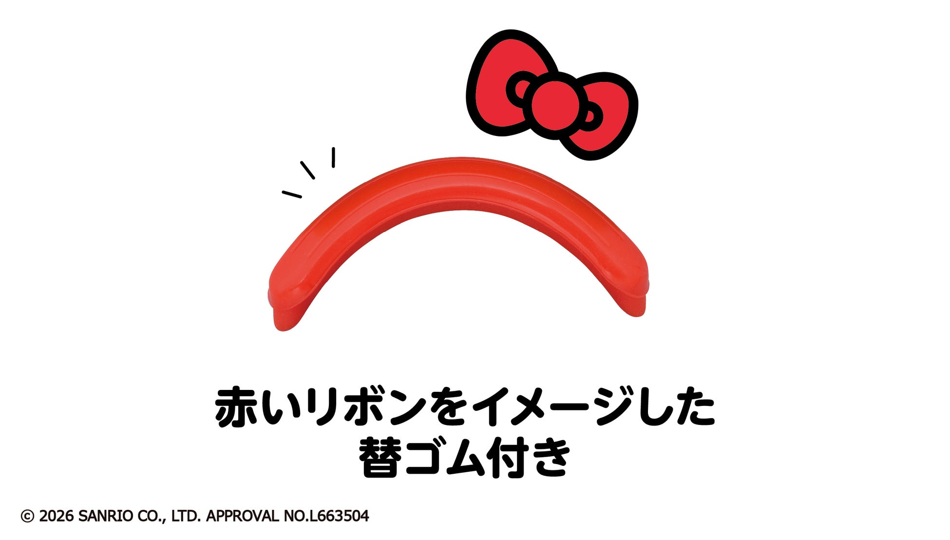 アイラッシュカーラー本体には、ハローキティとリボンのデザインとロゴが刻印されています。赤いリボンをイメージした限定カラーの替えゴムが付いたプレミアム仕様です。限定カラーの専用ケース(抗菌仕様)に、限定デコシール付き。● 20.5アール38mm幅。●替えゴム(限定色)2個付き。