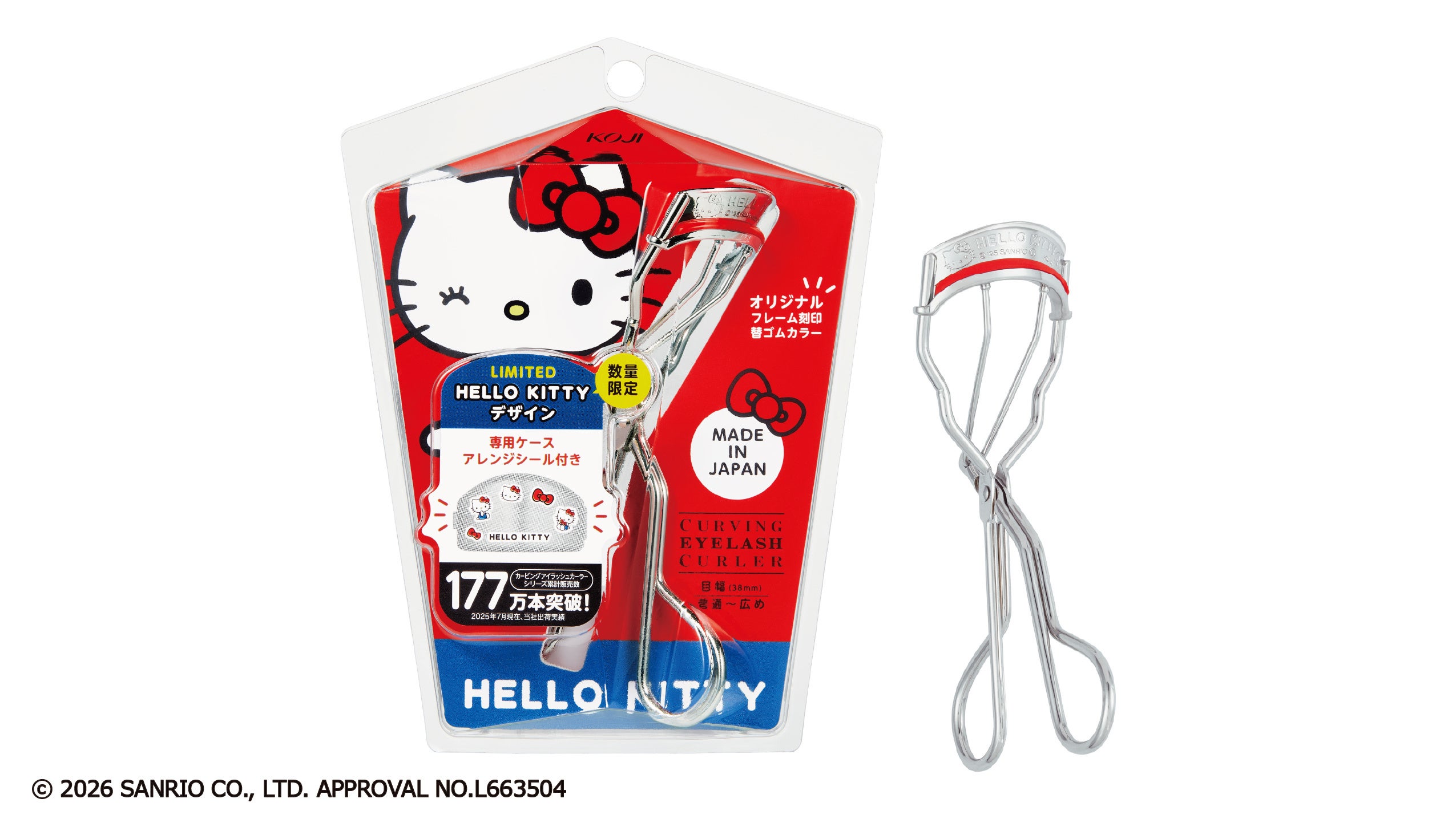 アイラッシュカーラー本体には、ハローキティとリボンのデザインとロゴが刻印されています。赤いリボンをイメージした限定カラーの替えゴムが付いたプレミアム仕様です。限定カラーの専用ケース(抗菌仕様)に、限定デコシール付き。● 20.5アール38mm幅。●替えゴム(限定色)2個付き。
