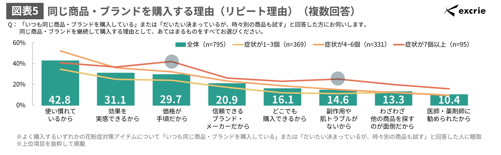 【商品リピート理由は「使い慣れている」「効果実感」、症状が多い人は価格と副作用のなさを重視する】