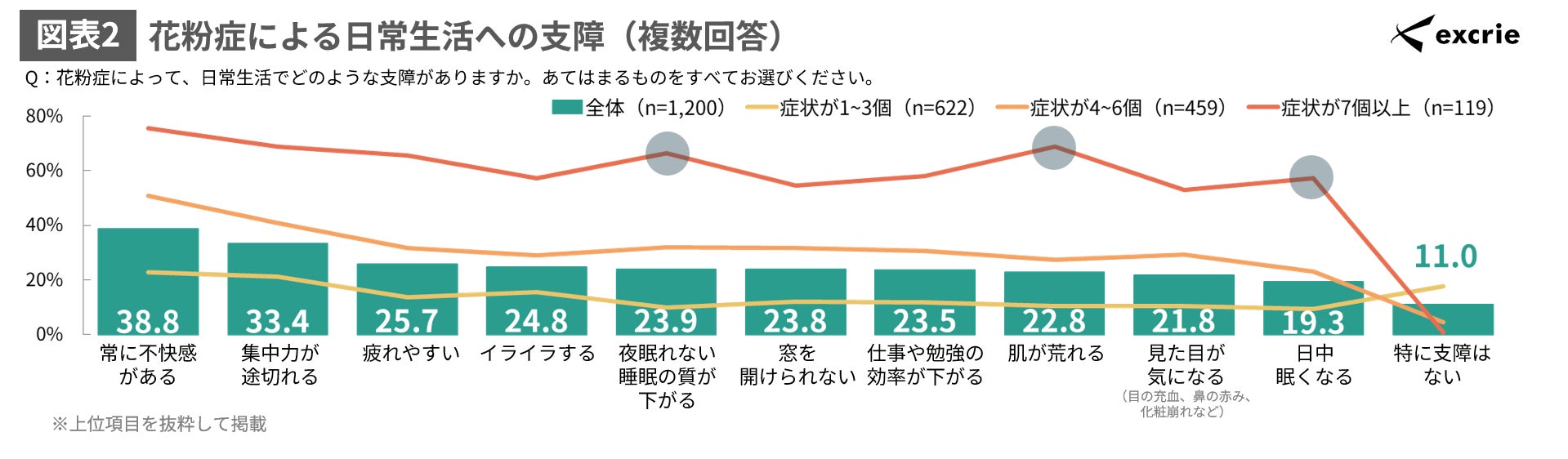 花粉症による日常生活への支障について聴取したところ、全体では「常に不快感がある」が38.8%と最も高く、次いで「集中力が途切れる」となりました。回答した症状が7個以上の人は、「肌が荒れる」「夜眠れない・睡眠の質が下がる」「日中眠くなる」が上位にきており、回答した症状が6個以下の人と比較すると傾向に若干の違いがあります。(図表2)