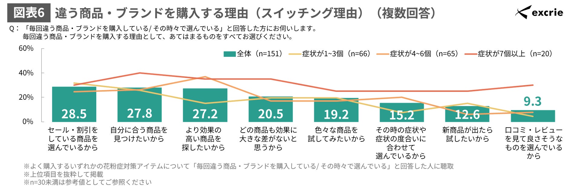花粉症対策アイテムについて、前回とは違う商品・ブランドを選ぶ理由について聴取したところ、全体では「セール・割引をしている商品を選んでいるから」が28.5%と最多で、次いで「自分に合う商品を見つけたいから」となっています。(図表6)