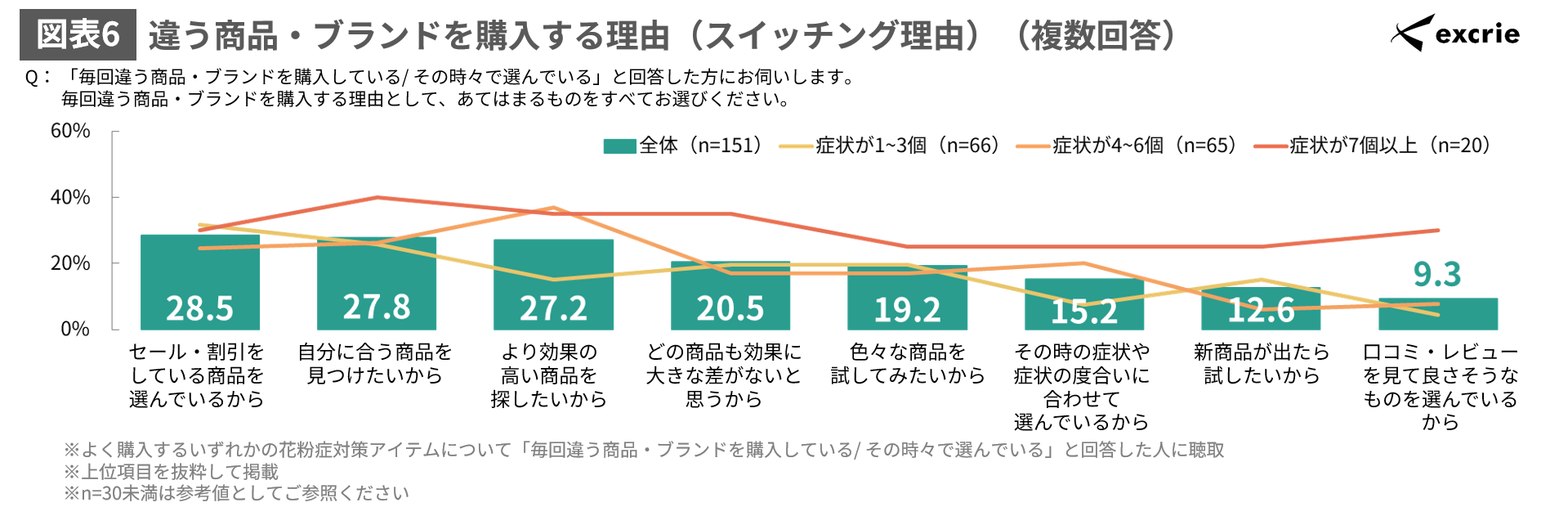 花粉症対策アイテムについて、前回とは違う商品・ブランドを選ぶ理由について聴取したところ、全体では「セール・割引をしている商品を選んでいるから」が28.5%と最多で、次いで「自分に合う商品を見つけたいから」となっています。(図表6)