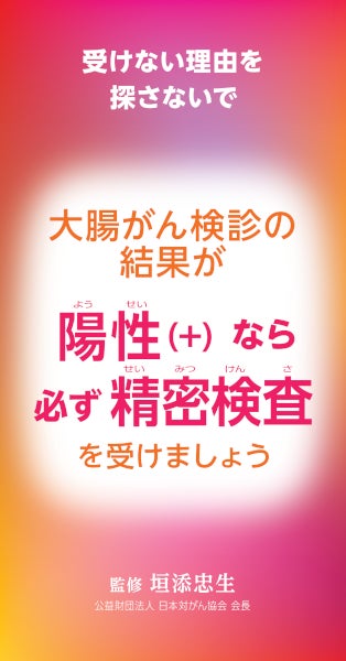 「2人に1人はがんにかかる」と言われるくらい、がんは身近な病気です。しかし一方で、「自分ががんになるなんて思ったこともない」「元気だし、具合が悪いところはないから大丈夫」「何かあったら病院で診てもらえばいい」と、身近に「がん」を考える人は多くないのが現状です。初期の大腸がんはほとんど症状がありません。症状が出たときには、進行している場合も多いです。健康であることを確認するため、また万が一、大腸がんがあった場合に早期発見・治療をするため、1年に1回大腸がん検診を受けよう、と呼びかける啓発資材を提供いたします。