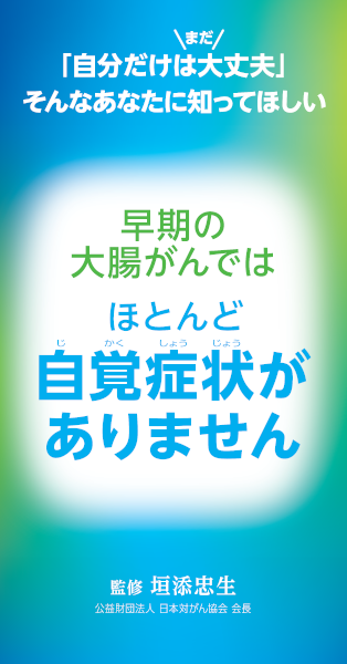 「2人に1人はがんにかかる」と言われるくらい、がんは身近な病気です。しかし一方で、「自分ががんになるなんて思ったこともない」「元気だし、具合が悪いところはないから大丈夫」「何かあったら病院で診てもらえばいい」と、身近に「がん」を考える人は多くないのが現状です。初期の大腸がんはほとんど症状がありません。症状が出たときには、進行している場合も多いです。健康であることを確認するため、また万が一、大腸がんがあった場合に早期発見・治療をするため、1年に1回大腸がん検診を受けよう、と呼びかける啓発資材を提供いたします。