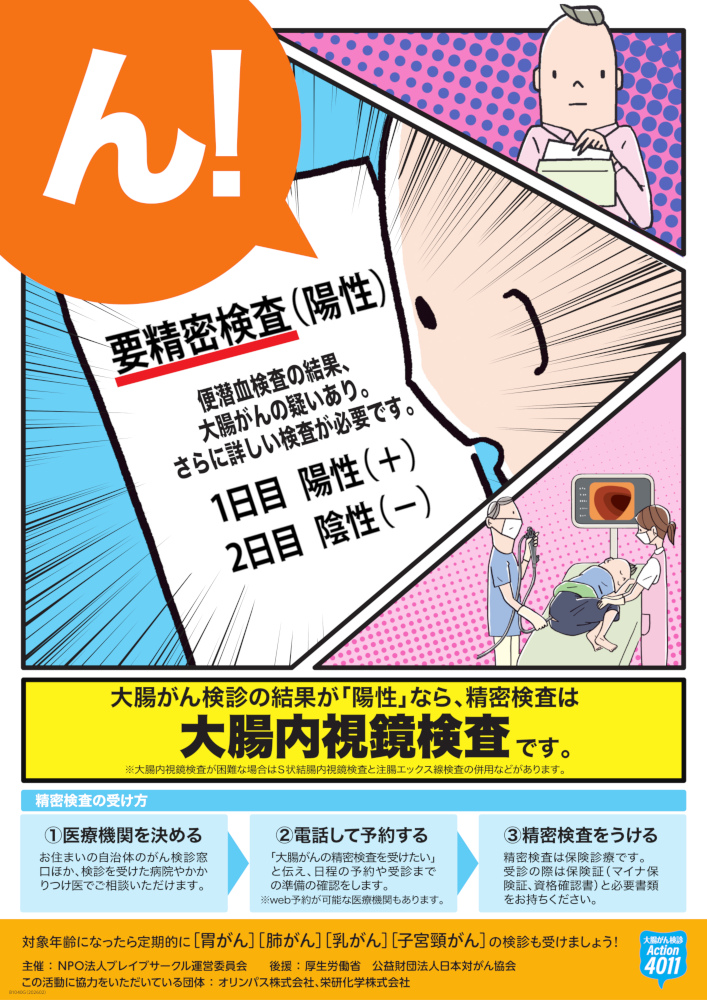 大腸がん検診(便潜血検査)で陽性(+)結果になった方の精密検査受診率が低いことも課題です。早期の大腸がんを見つけるチャンスでもあるので、「痔のせい」など自己判断せず必ず精密検査を受けてほしい、という切実な思いを込めて、精密検査用のポスターは結果を受け取ってから精密検査の受けるまでを印象づけるデザインにしました。