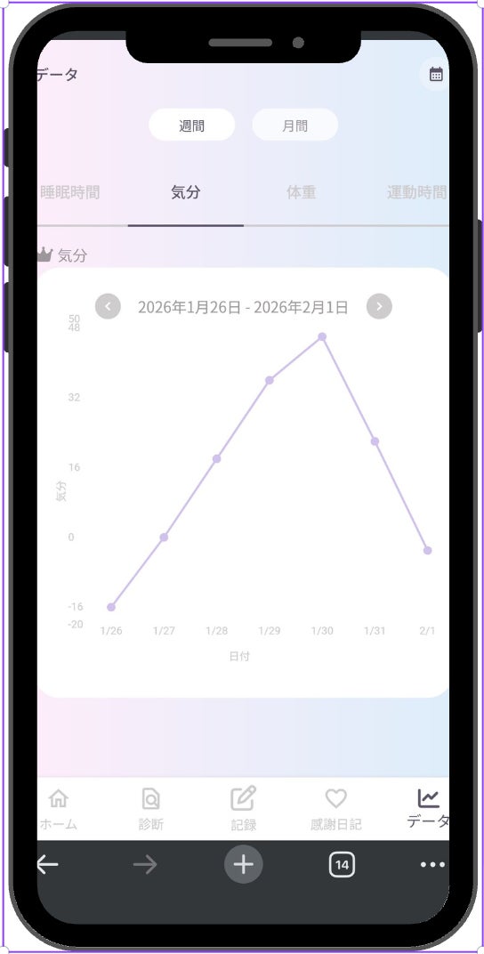 日々入力された思考や感情、行動に加え、体調に関する記録をもとに、ユーザー自身の心理状態や行動傾向を振り返りやすい形で可視化します。断片的になりがちな気分やコンディションの変化を整理して見渡すことで、自分でも気づきにくい傾向や関係性を把握できるようになります。