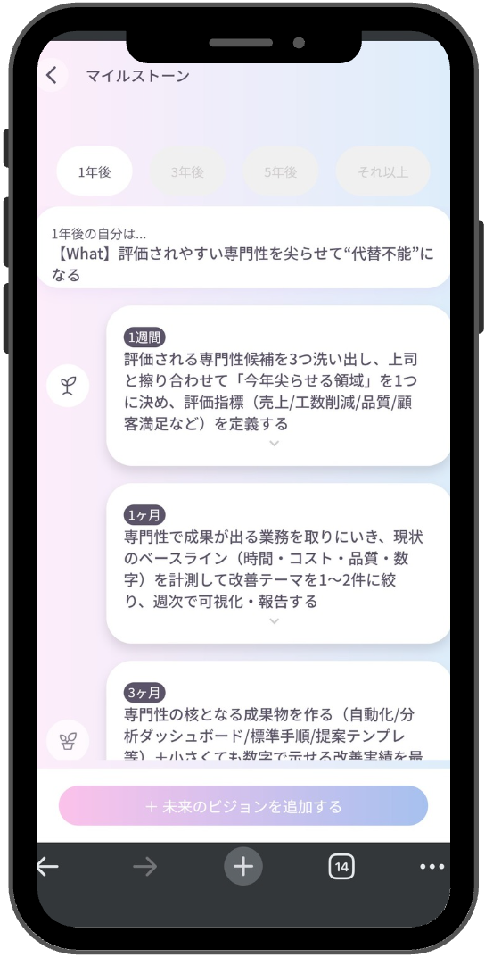 ユーザーが実現したい目標や現在取り組んでいる挑戦に応じて、AIが目標を細かなステップに分解し、短期・中期・長期のマイルストーンとして整理します。大きな目標を無理なく進められる形にすることで、行動への心理的ハードルを下げ、着実な前進を支援します。