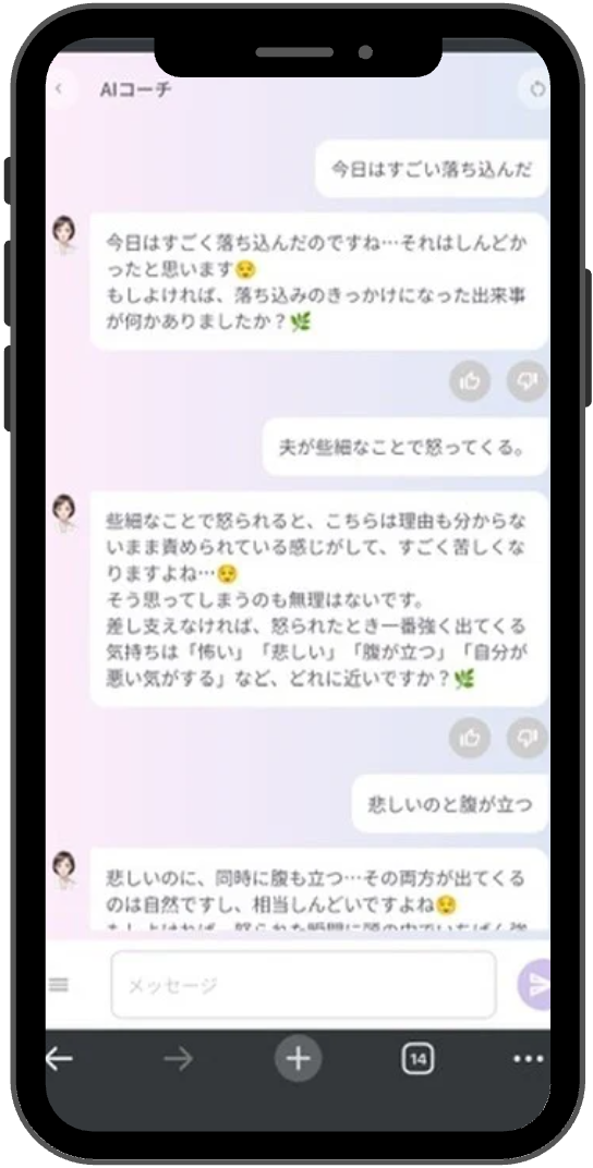 AIは「正しい・間違っている」と判断したり指示を出したりするのではなく、ユーザー自身が思考の捉え方や感情の背景に気づき、より自分に合った前向きな行動を選べるよう、複数の視点や選択肢を提示します。