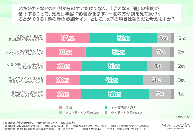 そこで、「スキンケアなどの外側からのケアだけでなく、土台となる『骨』の密度が低下することで、見た目年齢に影響が出ます。一般の方が鏡を見て気づくことができる『顔の骨の萎縮サイン』として、以下の項目は妥当だと考えるか」と尋ねたところ、項目別で以下のような回答結果になりました。