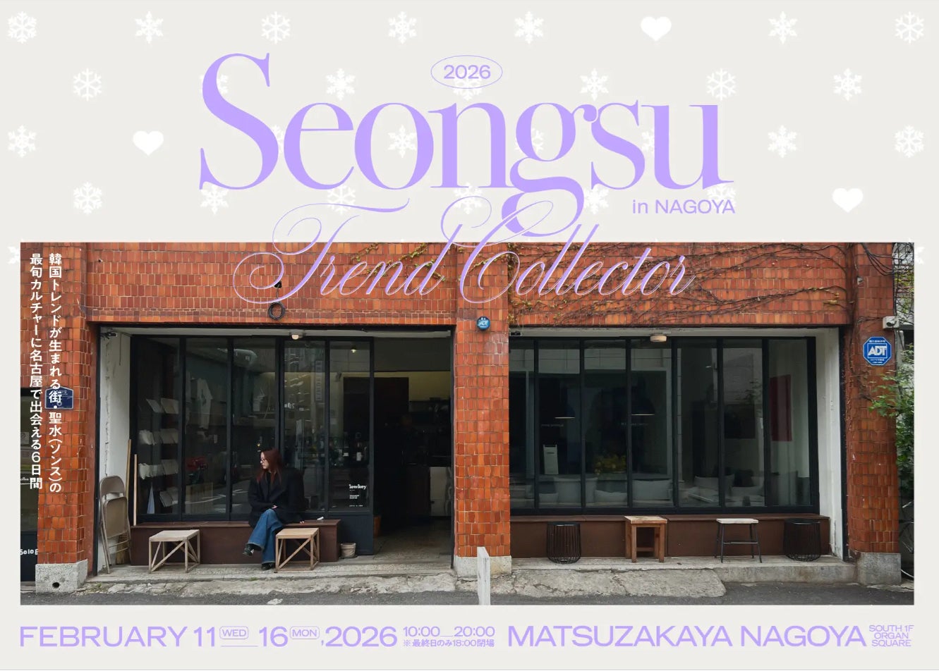 東京・大阪・仙台の3箇所で開催され、「最新カルチャーを体感できる」と韓国好きの間で話題沸騰中のイベント**「SEONGSU TREND COLLECTOR」**。今回の名古屋開催では、名古屋初上陸ブランドを含むソウル・聖水(ソンス)の人気ブランドが一堂に集結し、バレンタインシーズンならではの特別企画を実施します。