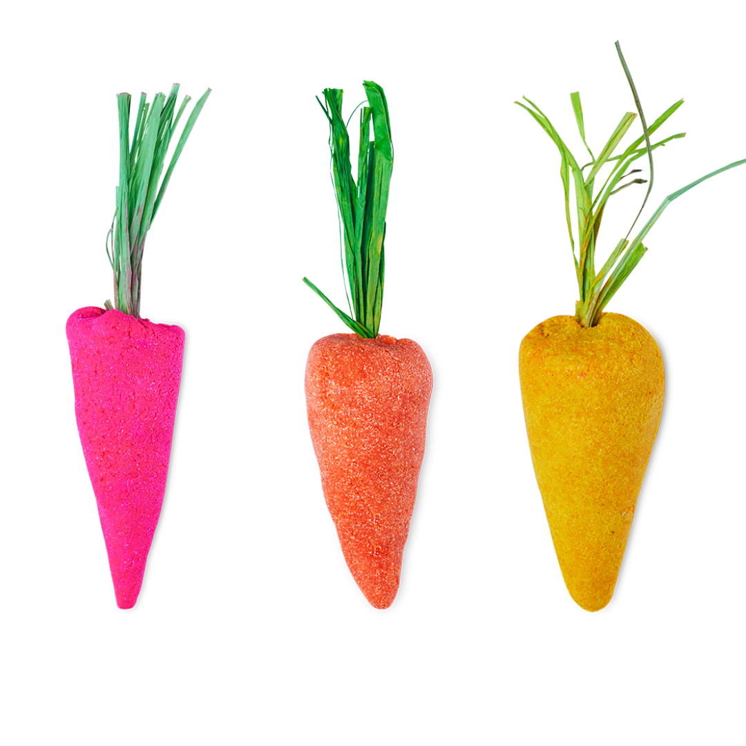 黄金色に輝くのはニンジンを食べたから?お湯の中にいれると、バニラの温かみのある香りと、グレープフルーツ、シチリアレモンの爽やかな香りのブレンドが広がります。また、ウサギが溶けていくと金色の渦巻が彩る緑色のお湯の中からグミのようなニンジン型のソープが登場!