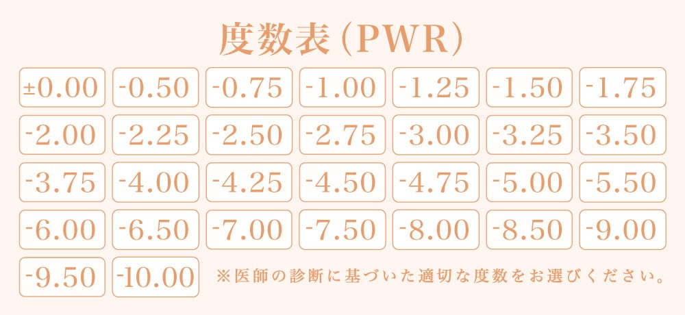 ■度数(PWR):±0.00(度なし) / -0.50~-5.00(0.25ステップ) / -5.50~-10.00(0.50ステップ)