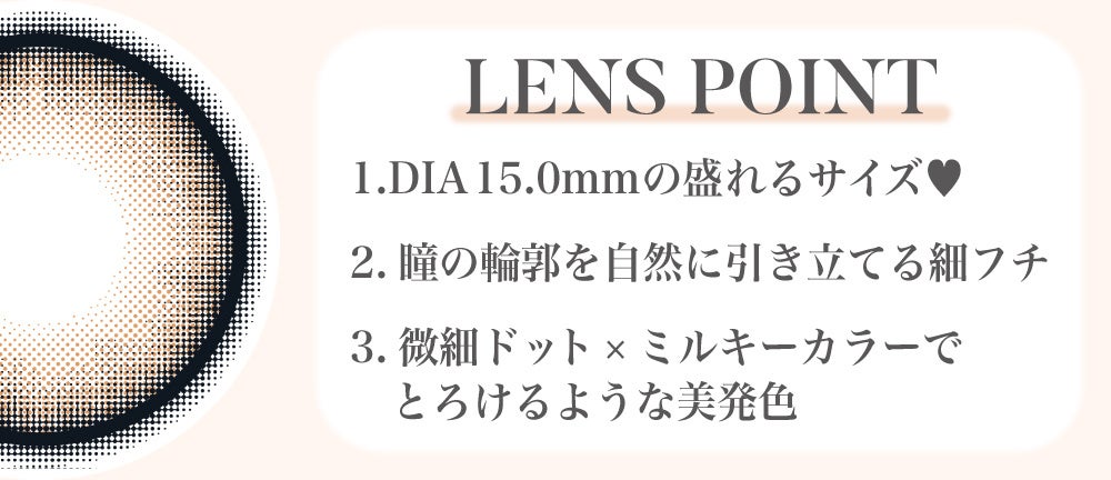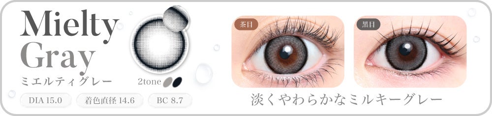 今回発売するのは「Mielty Brown(ミエルティブラウン)」と「Mielty Gray(ミエルティグレー)」の2色。“DIA15.0mmの大きめサイズ×とろけるようなミルキーカラー”の組み合わせで、瞳の印象を自然に明るく見せながら、大きめサイズならではの華やかな雰囲気を演出します。