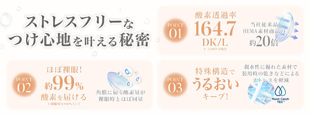 今回発売する新色2色はいずれもシリコーンハイドロゲル素材を使用し、酸素透過率は当社従来HEMA素材商品と比較すると約20倍となっています。酸素透過率が高いほど、角膜の健康に必要な酸素を瞳へより多く届けることができ、装用時の快適さをサポートします。角膜に届く酸素量は裸眼時を100%としたとき、約99%と裸眼時とほぼ同量になっており、まるで裸眼のような解放感ある着け心地を実現しました。
