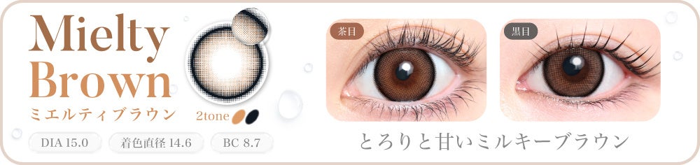 今回発売するのは「Mielty Brown(ミエルティブラウン)」と「Mielty Gray(ミエルティグレー)」の2色。“DIA15.0mmの大きめサイズ×とろけるようなミルキーカラー”の組み合わせで、瞳の印象を自然に明るく見せながら、大きめサイズならではの華やかな雰囲気を演出します。