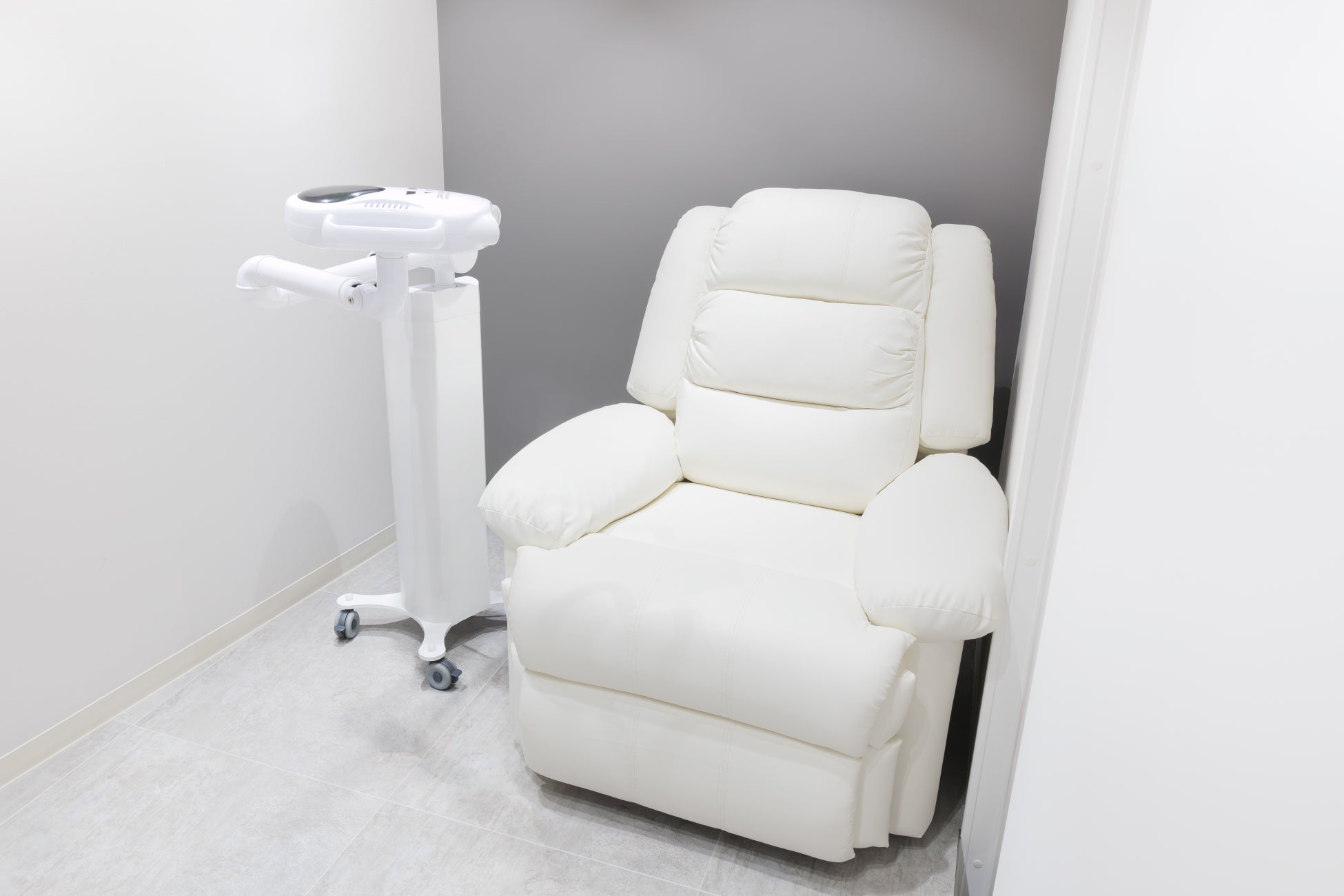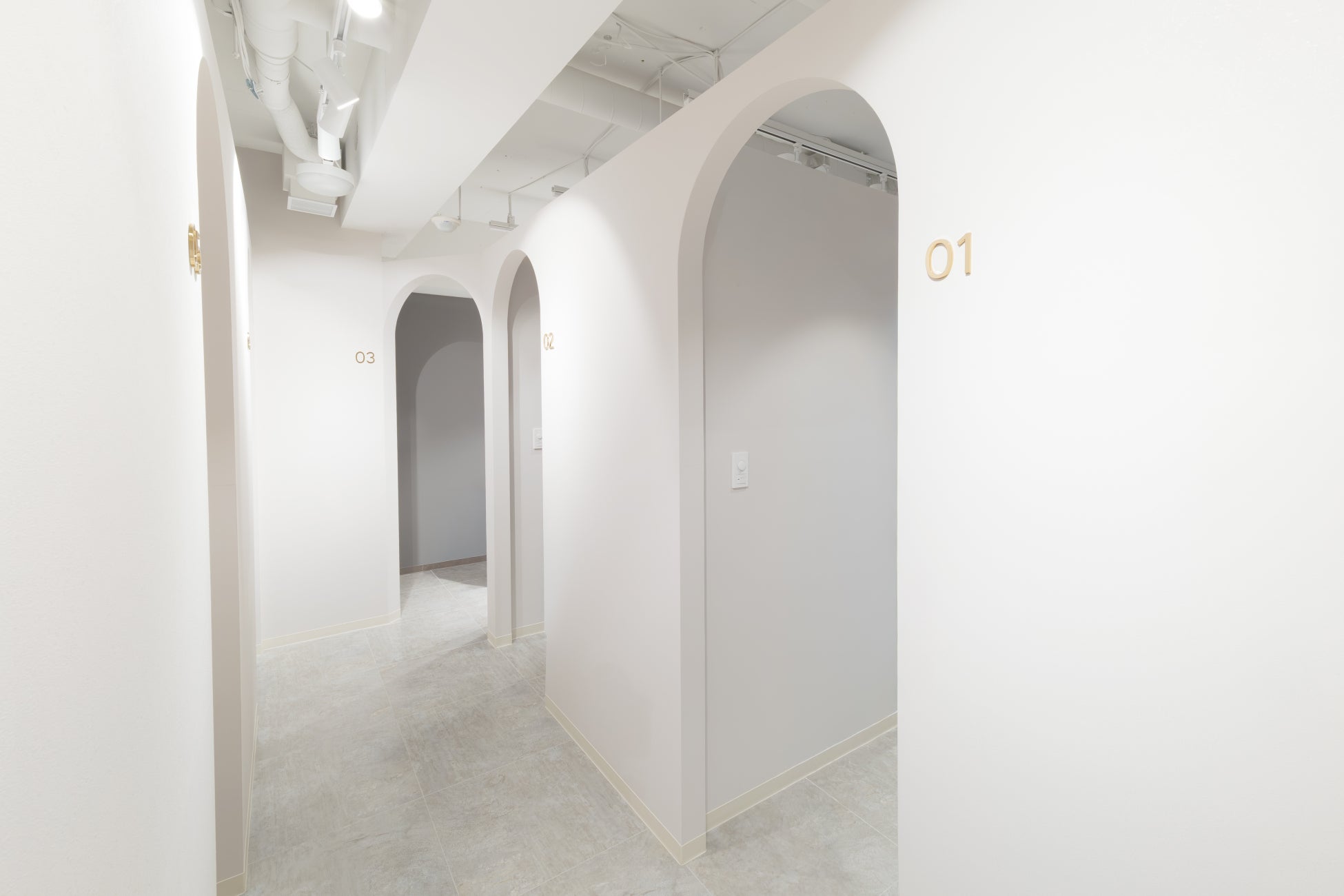 店舗内装は、白とグレーを基調にしたミニマルでスタイリッシュなデザインで、アーチ型の通路が柔らかな印象を与え、個室は清潔感と落ち着きを兼ね備えた空間設計となっています。誰もが心地よく過ごせるよう、施術ルームには快適なリクライニングチェアや施術ベッドを配置。プライバシーを重視した構造で、性別を問わずリラックスできる環境を提供します。