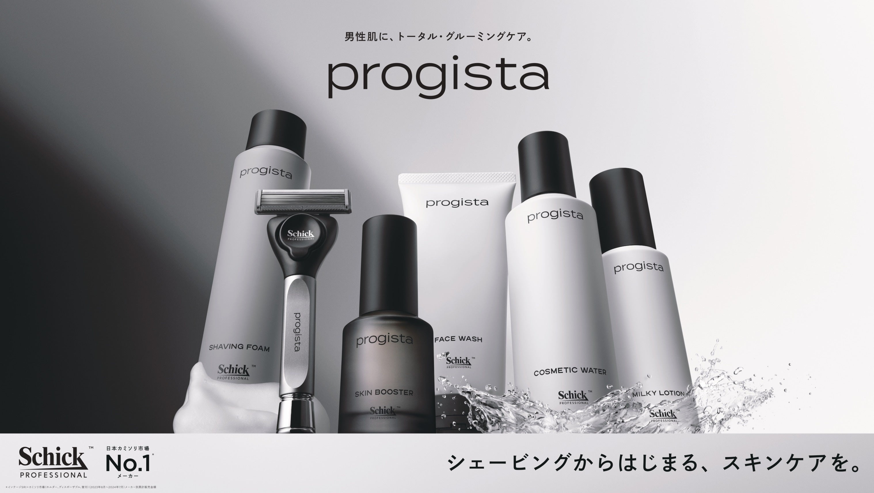 シェービング肌*9を知り尽くした日本カミソリ市場No.1*1のシックと、男性肌を知り抜いた専門家。ふたつの出会いから誕生した、シェービングからはじまるスキンケアブランド「progista(プロジスタ)」。100年以上のシェービング研究の知見を基に、シェービング前後の肌ケアにコミット。濃密泡の薬用シェービングフォーム、プロ仕様の仕上がりを叶えるショートハンドルシェーバー、そしてカミソリ負けや肌荒れを防ぐスキンケアアイテムまで取り揃え、清潔感あふれる健やかな肌へと導きます