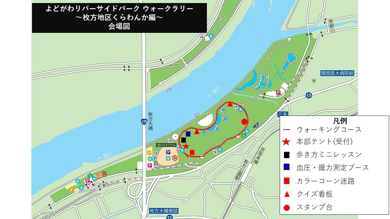 枚方地区にある1,200mのウォーキング・ジョギングコースを歩きながら、クイズやスタンプラリーに挑戦。小さなお子様も楽しくご参加いただけるので、親子でのご参加にもおススメです。